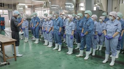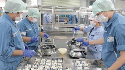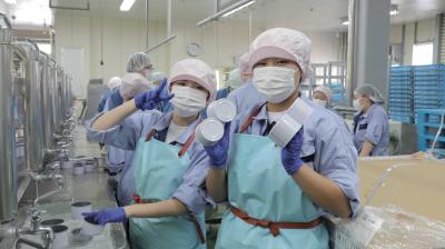 生徒たちはまず、肉厚の皮を丁寧に剥ぎ、歯ごたえを活かすために繊維に沿って切ったムラサキイカをボイル後、缶に詰めました。その後、おろしたての生姜を加えた特製の調味液を注ぎ、巻締め・殺菌の工程を経て、味付け缶詰が完成しました。