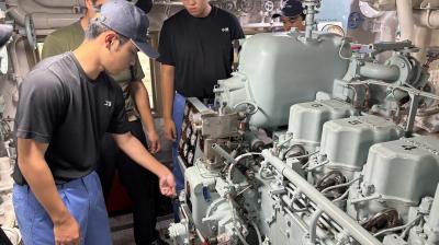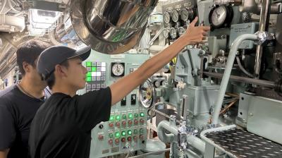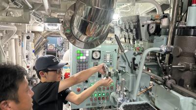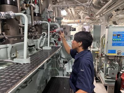 機関乗船実習では、実際の青森丸の機関について学ぶことができます。